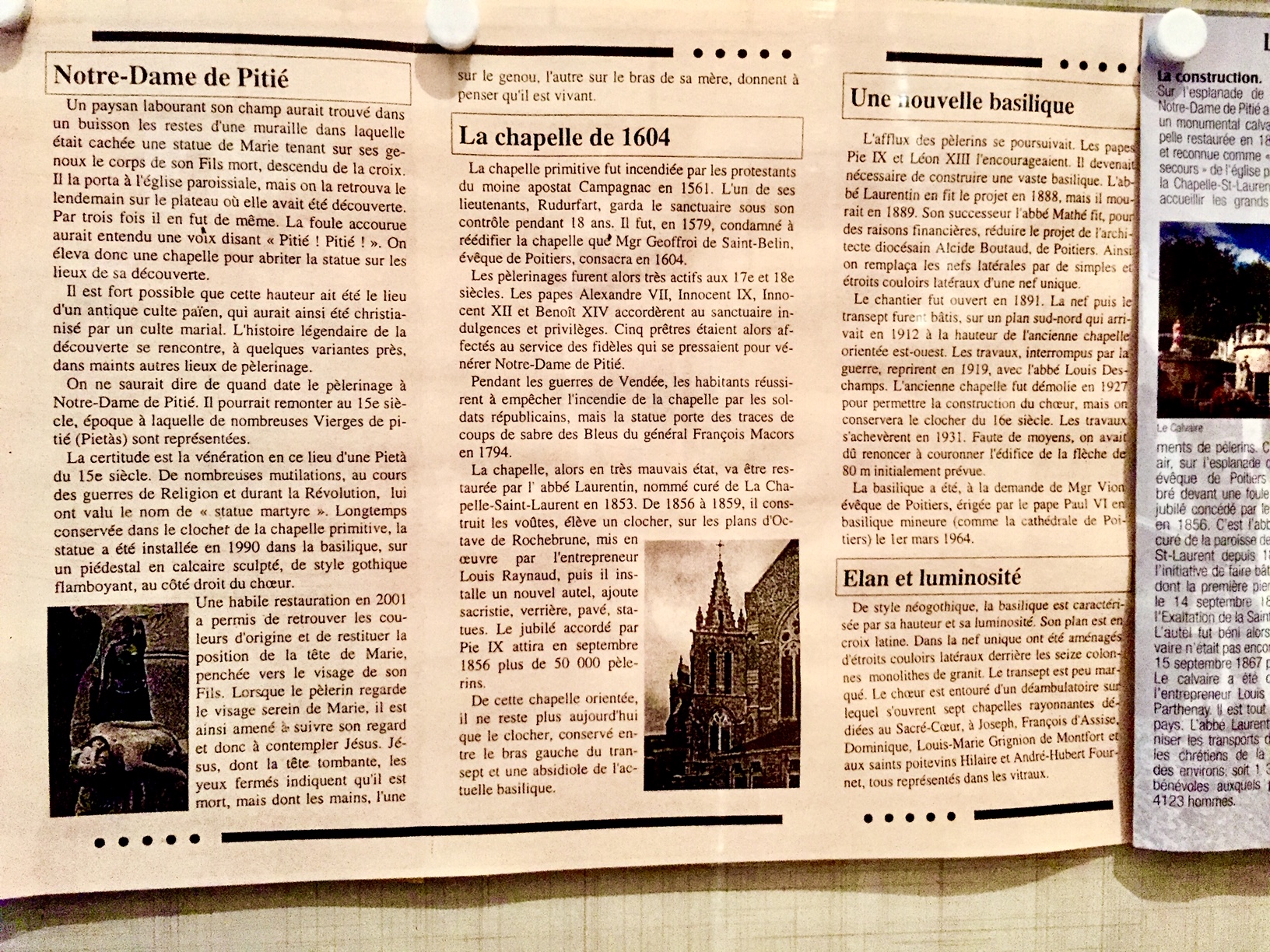une basilique dans un lieu improbable. Dans un endroit très isolé, c'est une apparition vraiment surprenante que cette immense construction récente. Son histoire remonte au 16ème siècle. Un calvaire unique en Poitou jouxte cette basilique sur la place de ce lieu-dit. L’ensemble est protégé depuis 2008. Basilique mineure construite aux 4ème quart du 19ème siècle et au 1er quart du 20ème siècle, c'est un monument très impressionnant par sa taille et surprenant car la flèche n'a jamais été construite, faute de moyens. Seule, un petit clocher, plus ancien est présent sur le coté de l’édifice mais moins haut que ce dernier. Un monument rare et unique dans la région À l’autre bout du parc de la basilique de La Chapelle St Laurent, voici un calvaire qui ne laisse pas indifférent ne serait-ce que par ses dimensions monumentales. 14 statues en fonte, en granit ou en terre dominent l'édifice. 14 pilastres de granit encerclent ce monument : à l'intérieur de ces pilastres, 14 bas-reliefs représentant 14 stations du chemin de croix. Dans le soubassement, une petite chapelle construite à l'emplacement où Mgr Pie célébra en 1856 la messe du jubilé concédé par le pape Pie IX. Une chapelle haute s'ouvre sur un parvis ouvert de trois côté. Cela permet de s'adresser aux fidèles regroupés à l'ombre des arbres du parc qui sépare le Calvaire de la basilique.