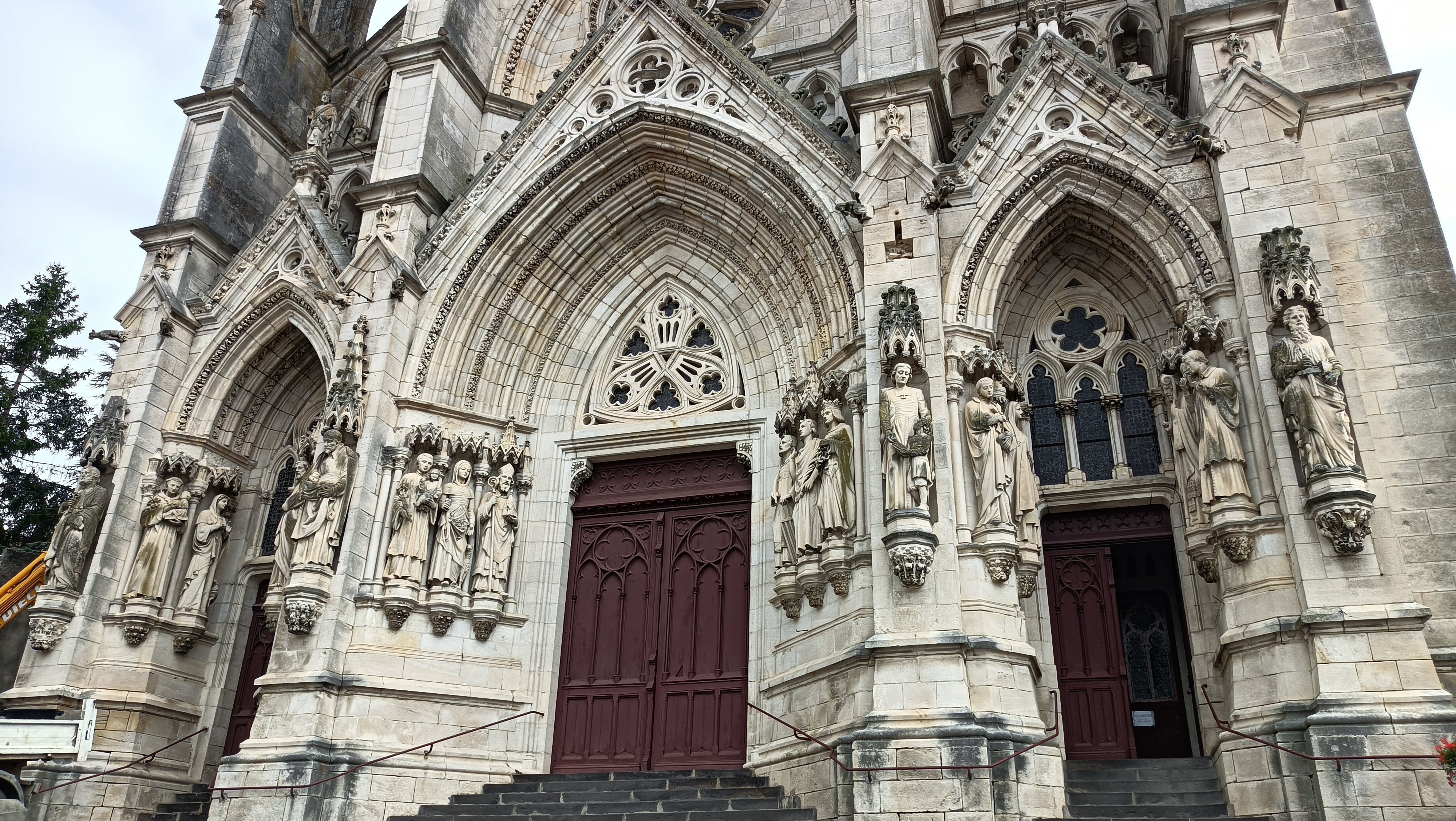 Une pure merveille, à voir si vous êtes dans la région. La façade est ornée de grands personnages sculptés, de gargouilles une vraie dentelle de pierre. A l'intérieur, vitraux magnifiques racontant la bible façon bande dessinée et chemin de croix avec des panneaux en relief. Quelques places de stationnement en face. On voit très bien la basilique dans le parc dit des Eaux Vives.