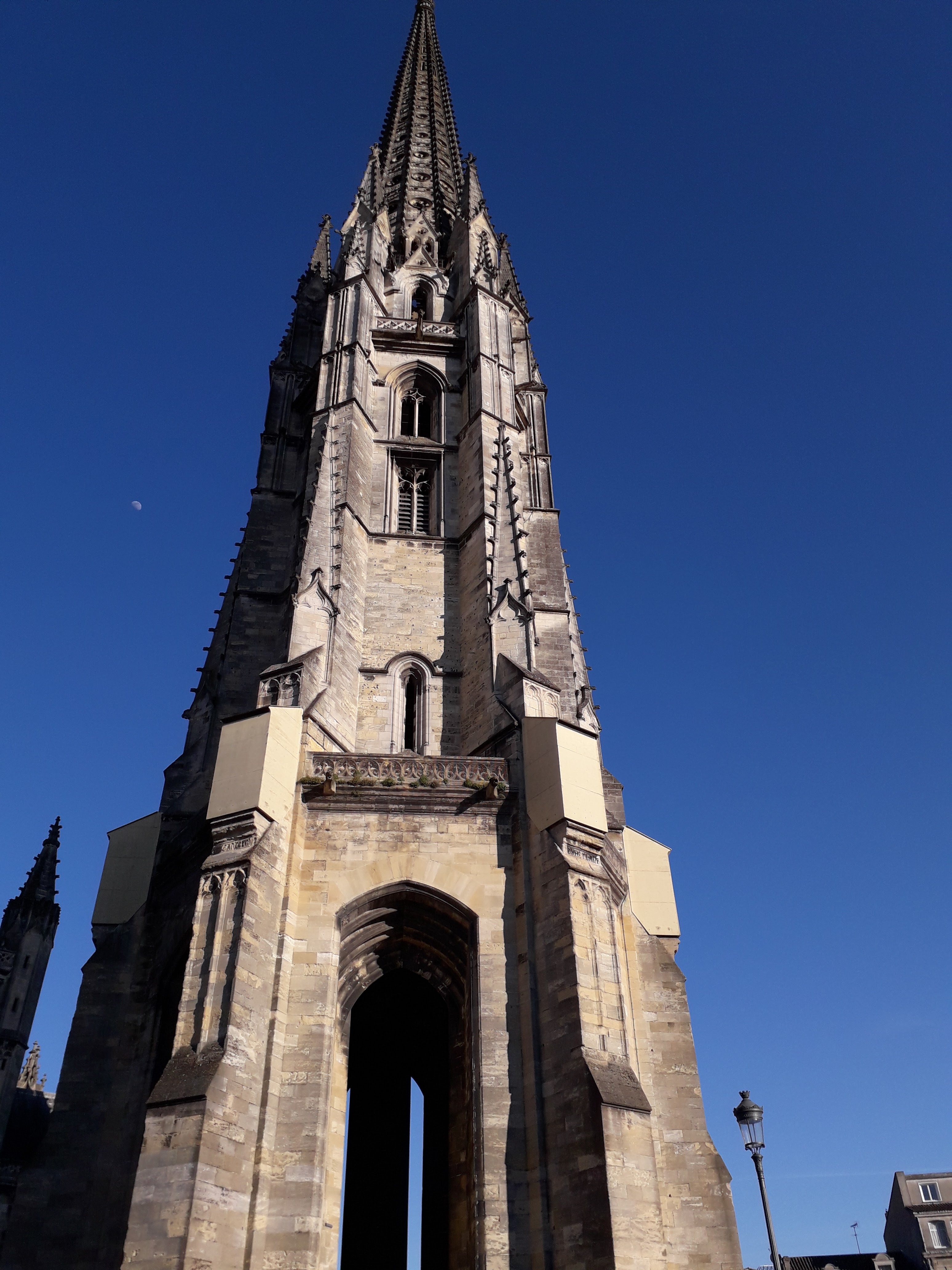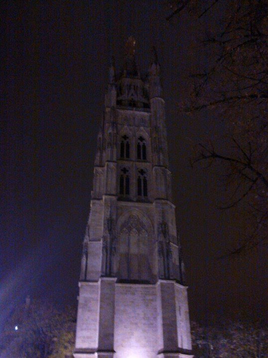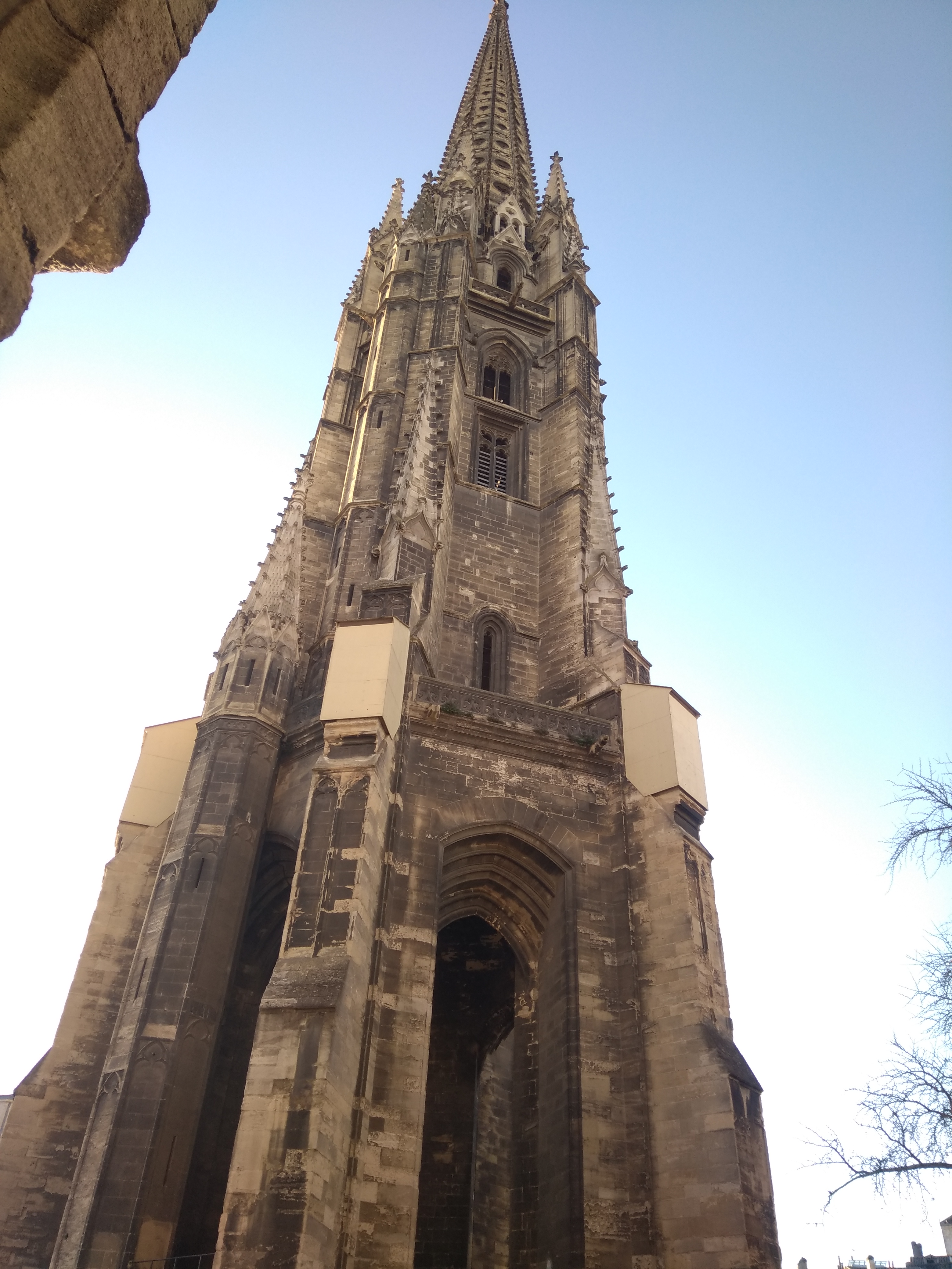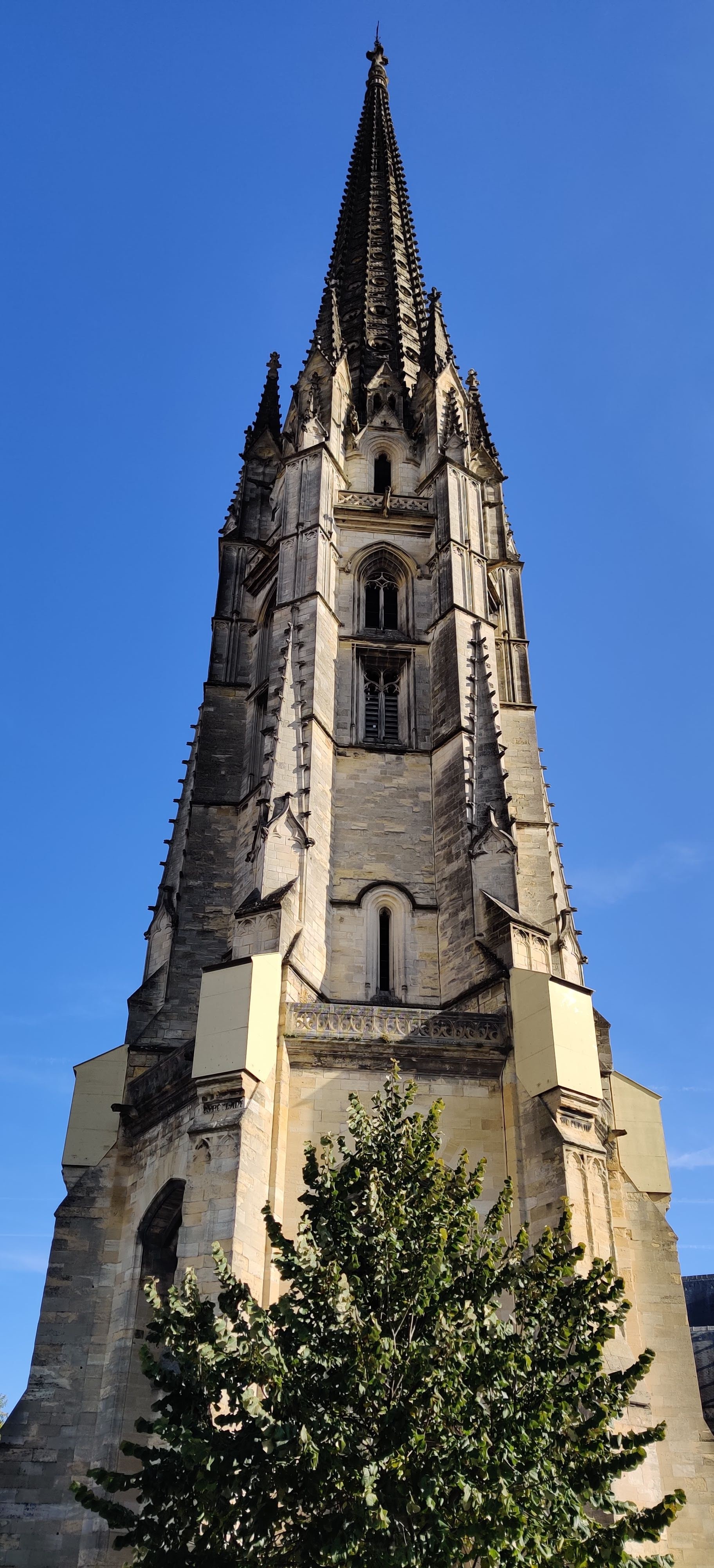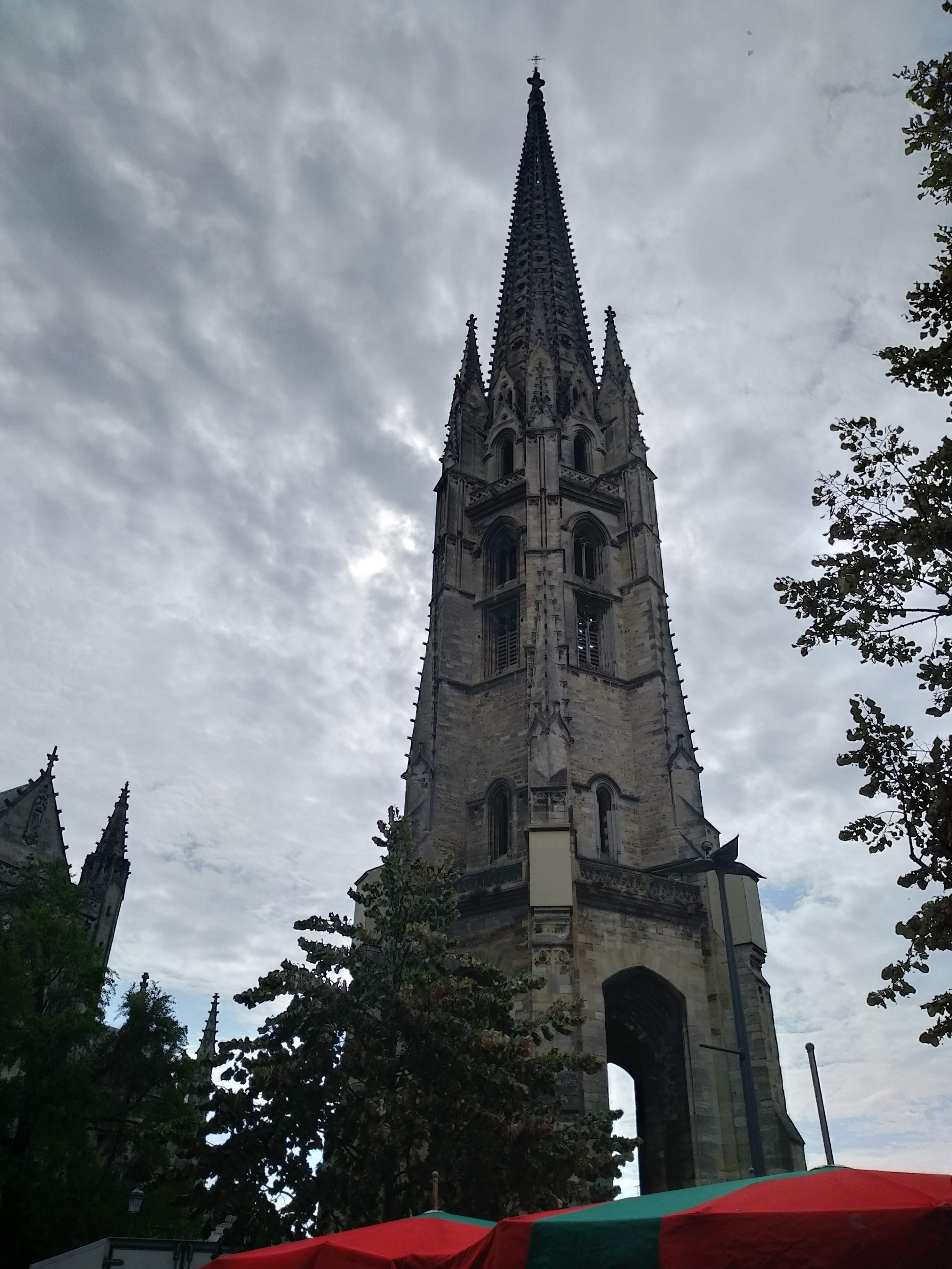 Très joli bâtiment gothique flamboyant construit entre le 14eme et 16eme siècle. Notre surprise, le clocher indépendant du sanctuaire. Le clocher à été séparé de l'église pour éviter que le poids de celui-ci ne déstabilise le bâtiment de l’église. En effet, la présence de sols marécageux instables dans le sous-sol bordelais risquait de provoquer l’effondrement du clocher fortement soumis aux vibrations.