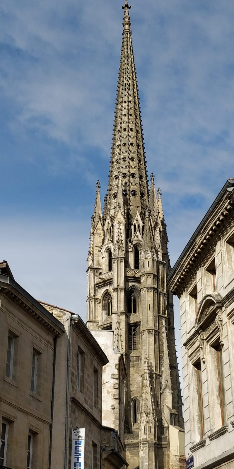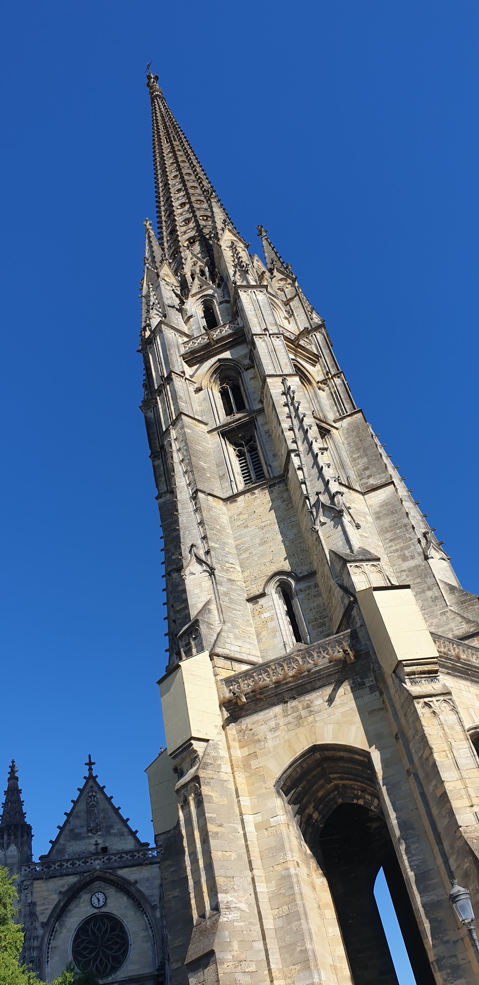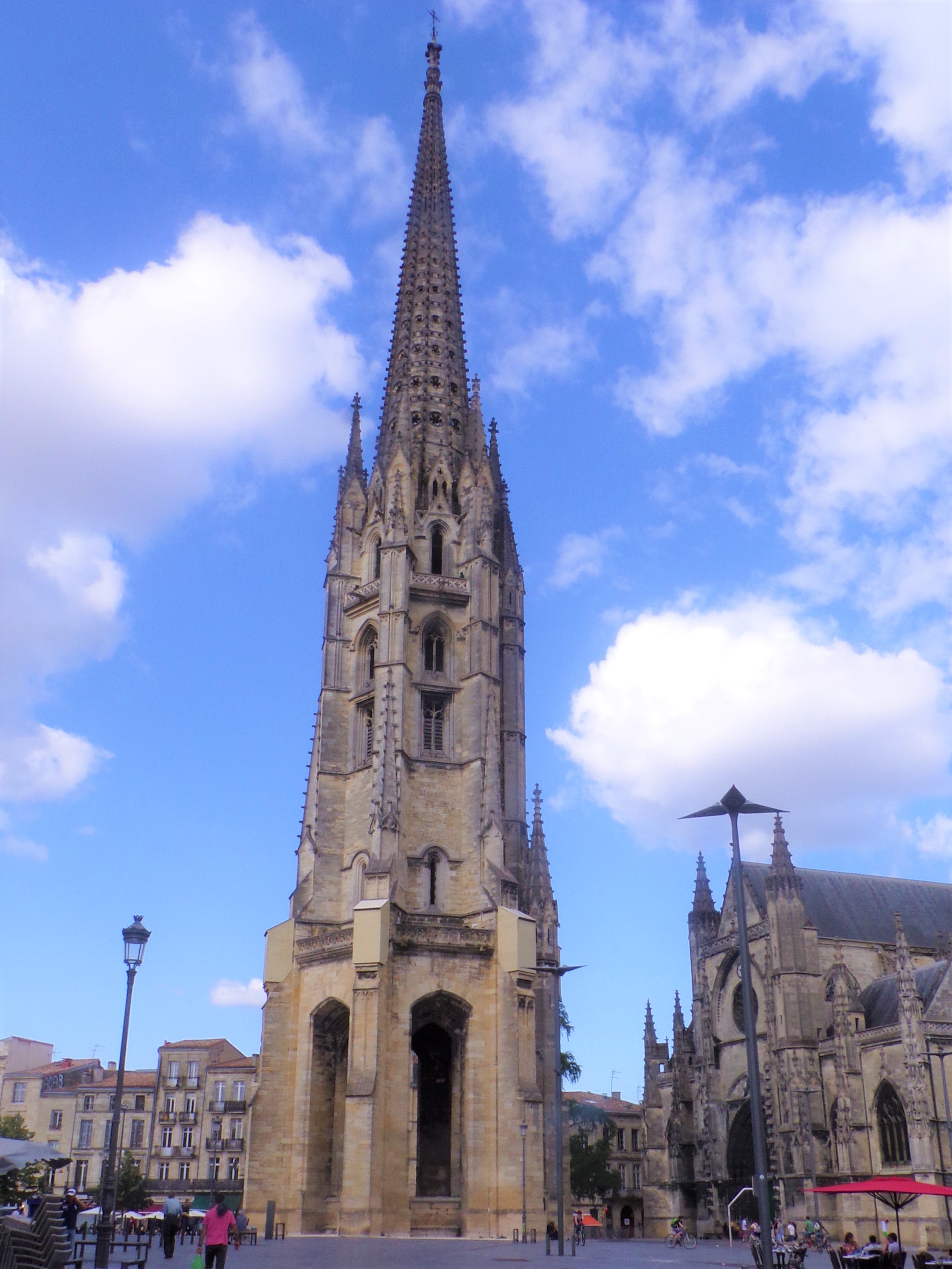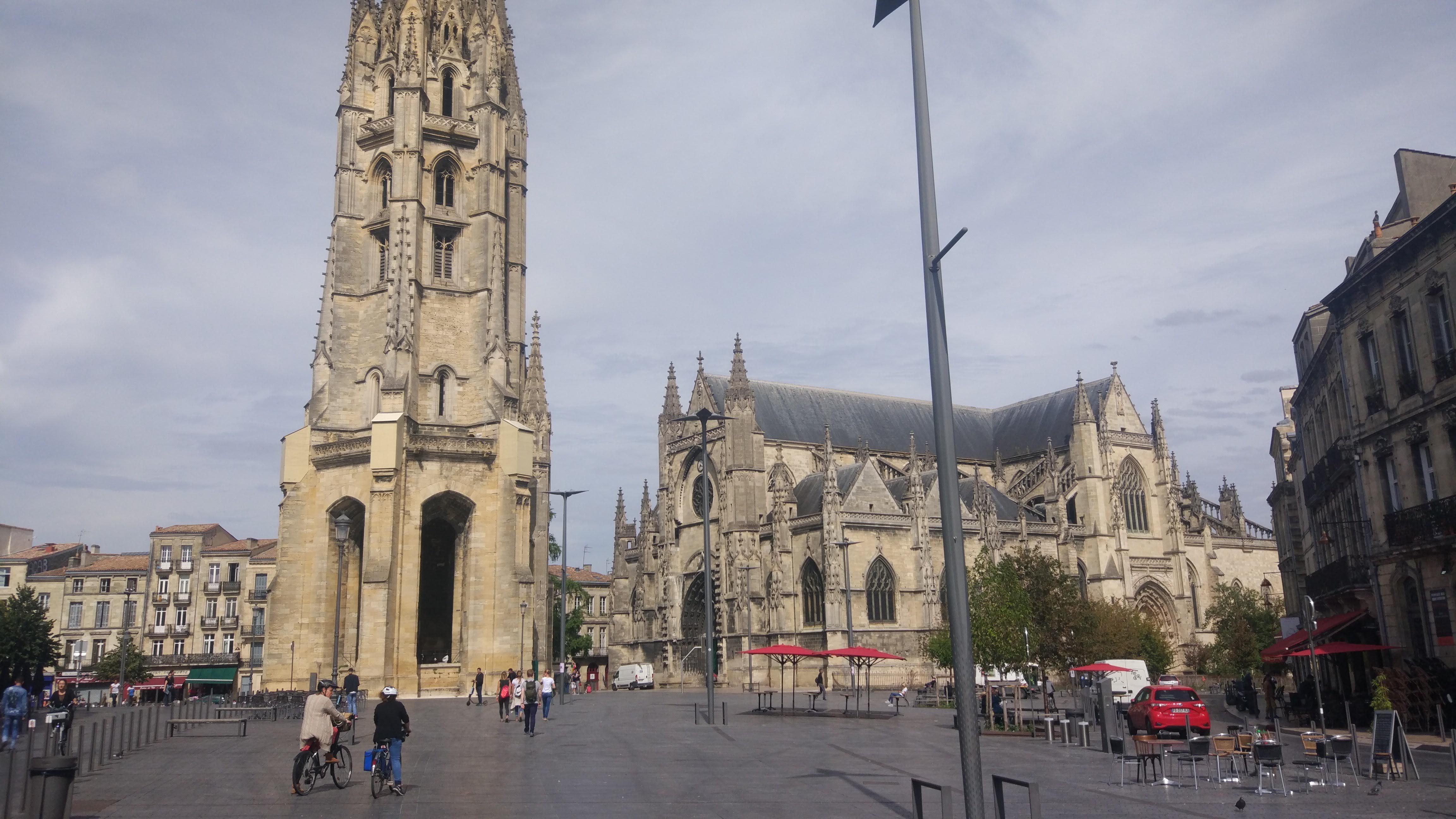Très joli bâtiment gothique flamboyant construit entre le 14eme et 16eme siècle. Notre surprise, le clocher indépendant du sanctuaire. Le clocher à été séparé de l'église pour éviter que le poids de celui-ci ne déstabilise le bâtiment de l’église. En effet, la présence de sols marécageux instables dans le sous-sol bordelais risquait de provoquer l’effondrement du clocher fortement soumis aux vibrations.