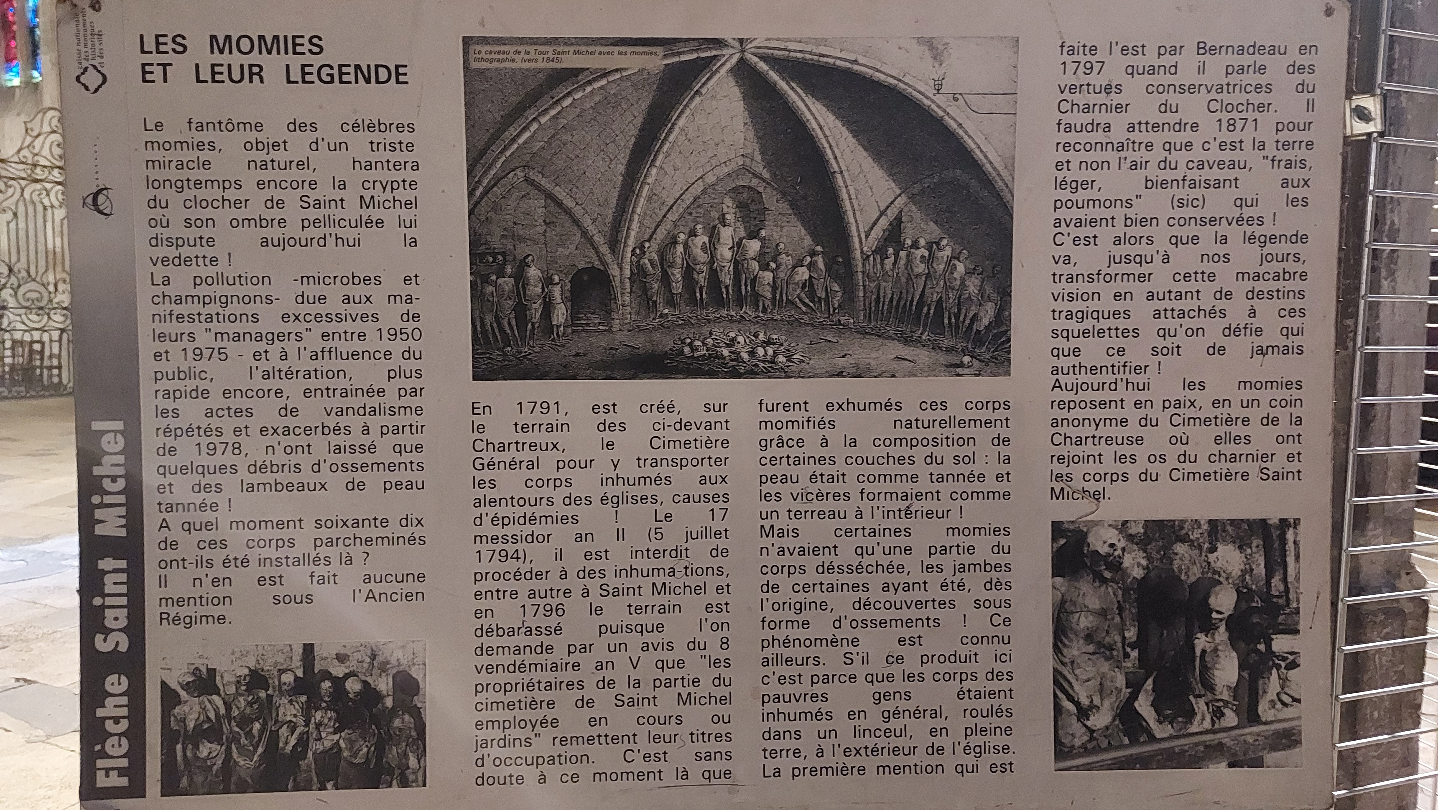 La basilique Saint-Michel de Bordeaux partage avec la cathédrale Saint-André la particularité d’être dotée d’un clocher indépendant. Ici, curieusement, sa Flèche a été édifiée au XVe siècle sur un ancien charnier où furent installées à la fin du XVIIIe siècle des momies exhumées du cimetière situé jadis à l’entour. Par leurs figures crispées ces corps desséchés hanteront longtemps la crypte Saint-Michel. Ainsi ces momies (elles étaient près de 70) ont attiré des milliers de visiteurs dont quelques écrivains illustres comme, Victor Hugo, Gustave Flaubert, Théophile Gautier ou plus près de nous Ferdinand Céline. On pouvait y voir « L’Enterré vivant », « la famille empoisonnée par les champignons», « L’africaine », un général tué en duel, etc … Cette ronde macabre prit fin en 1990. Aujourd’hui un audiovisuel reconstitue la genèse de cette exhibition dont beaucoup de bordelais ont gardé un souvenir.