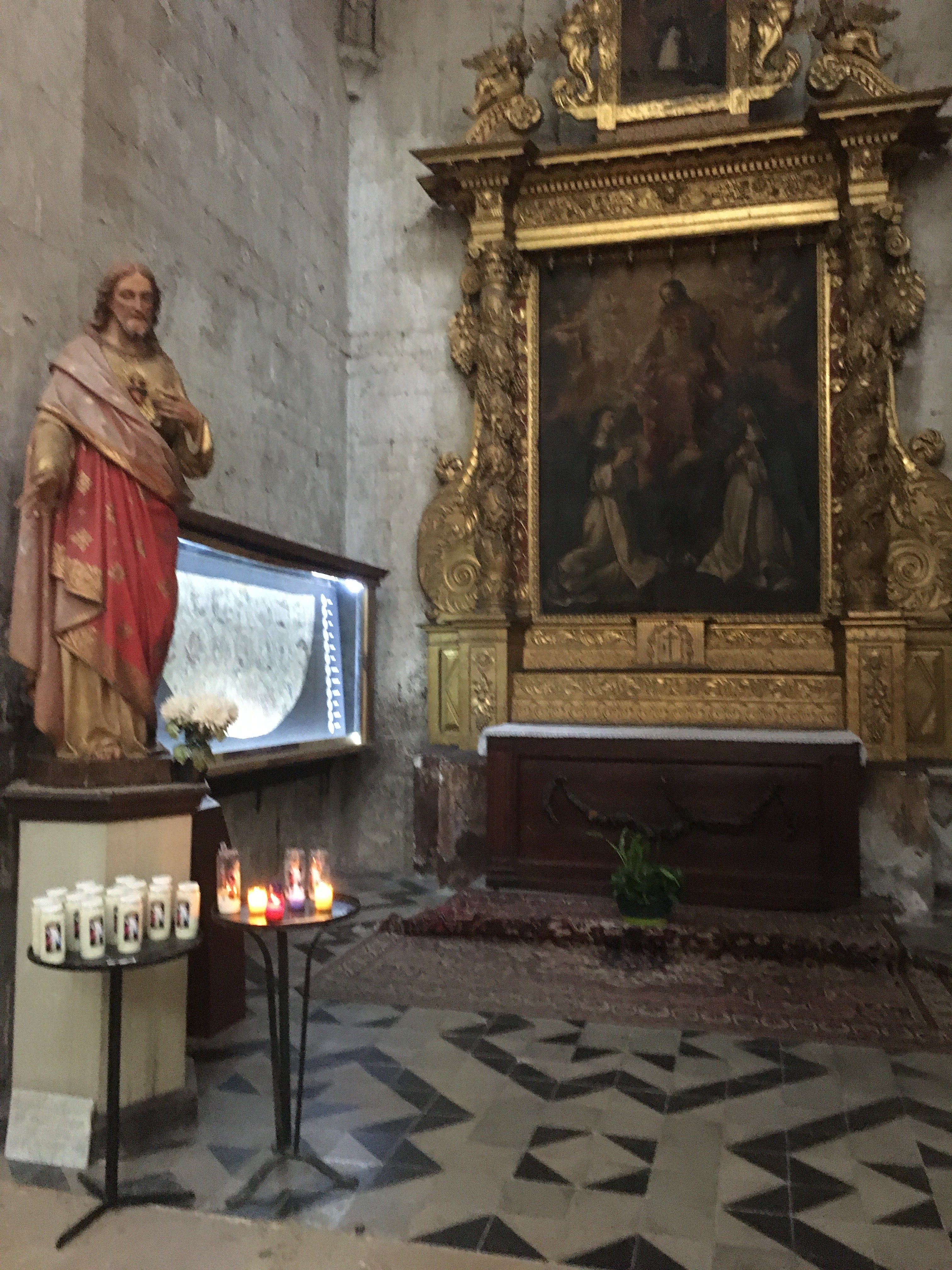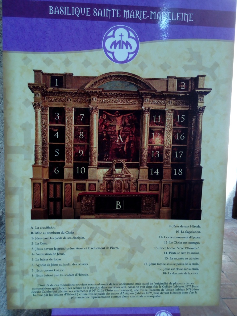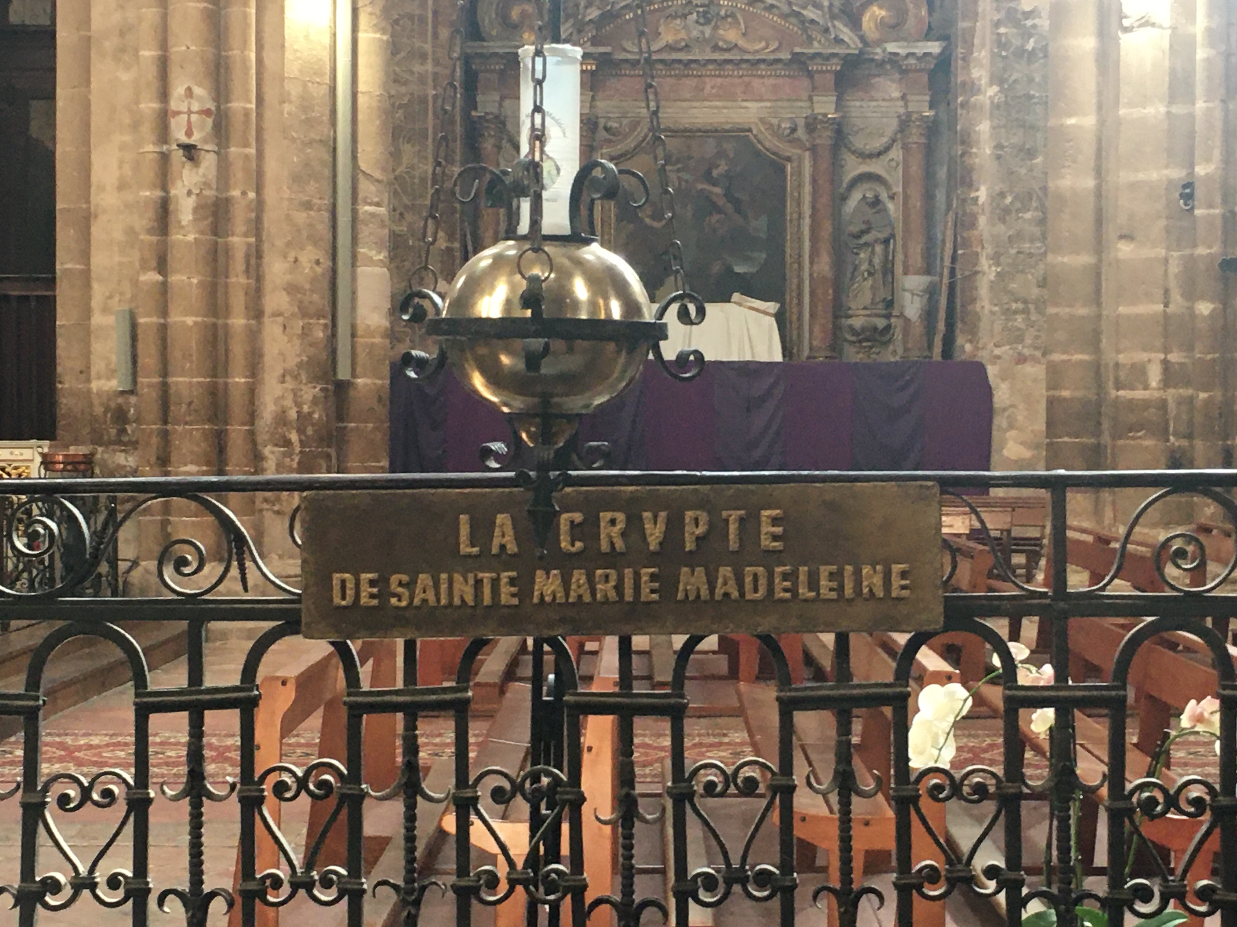 Tout d’abord la lumière qui entre pour illuminer cet imposant édifice. Puis les autels dédiés avec des peintures, comme les retables, qui datent de plusieurs siècles. Et l’orgue que nous avons eu la chance d’écouter un moment. Et enfin la crypte avec les reliques de Marie Madeleine. Un grand moment de sérénité m’a envahie.