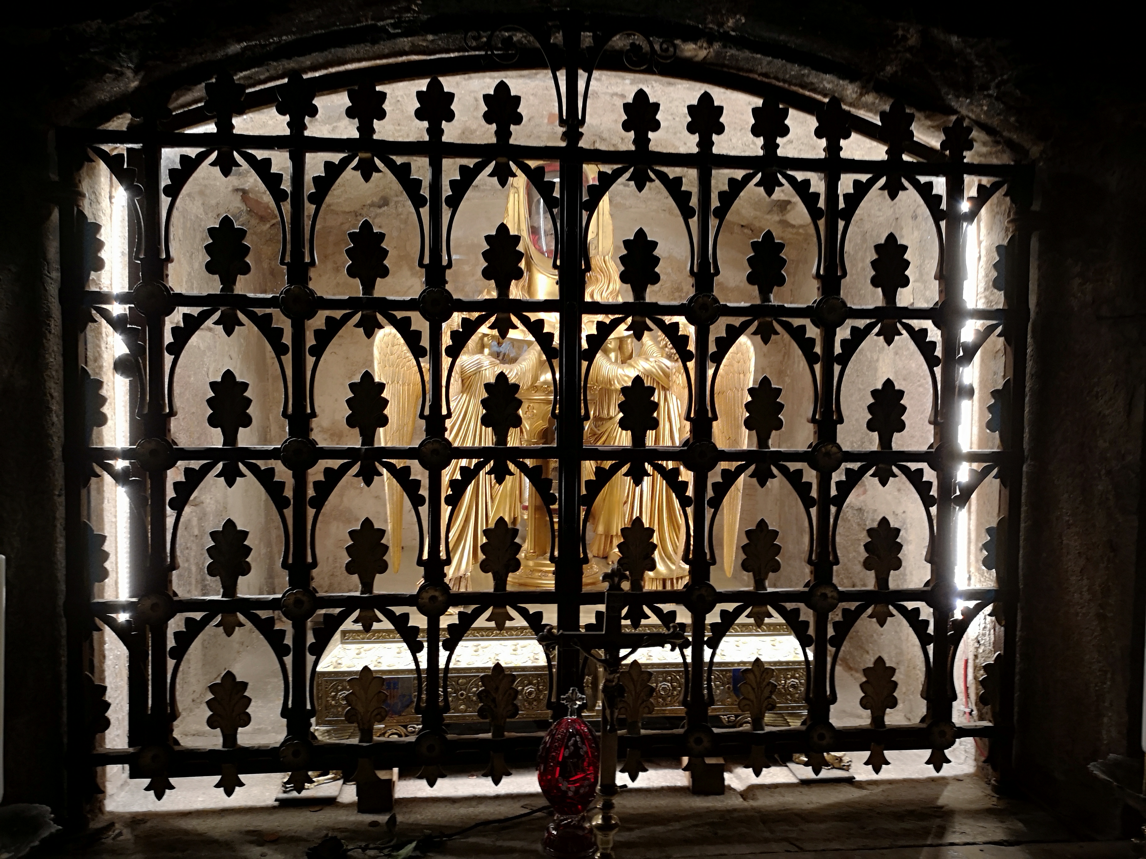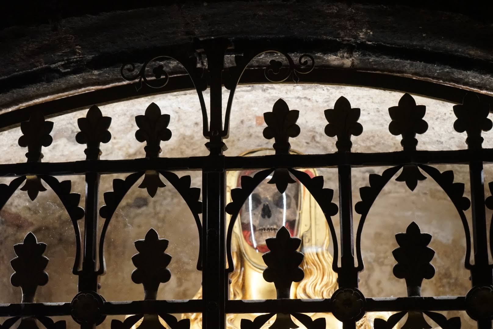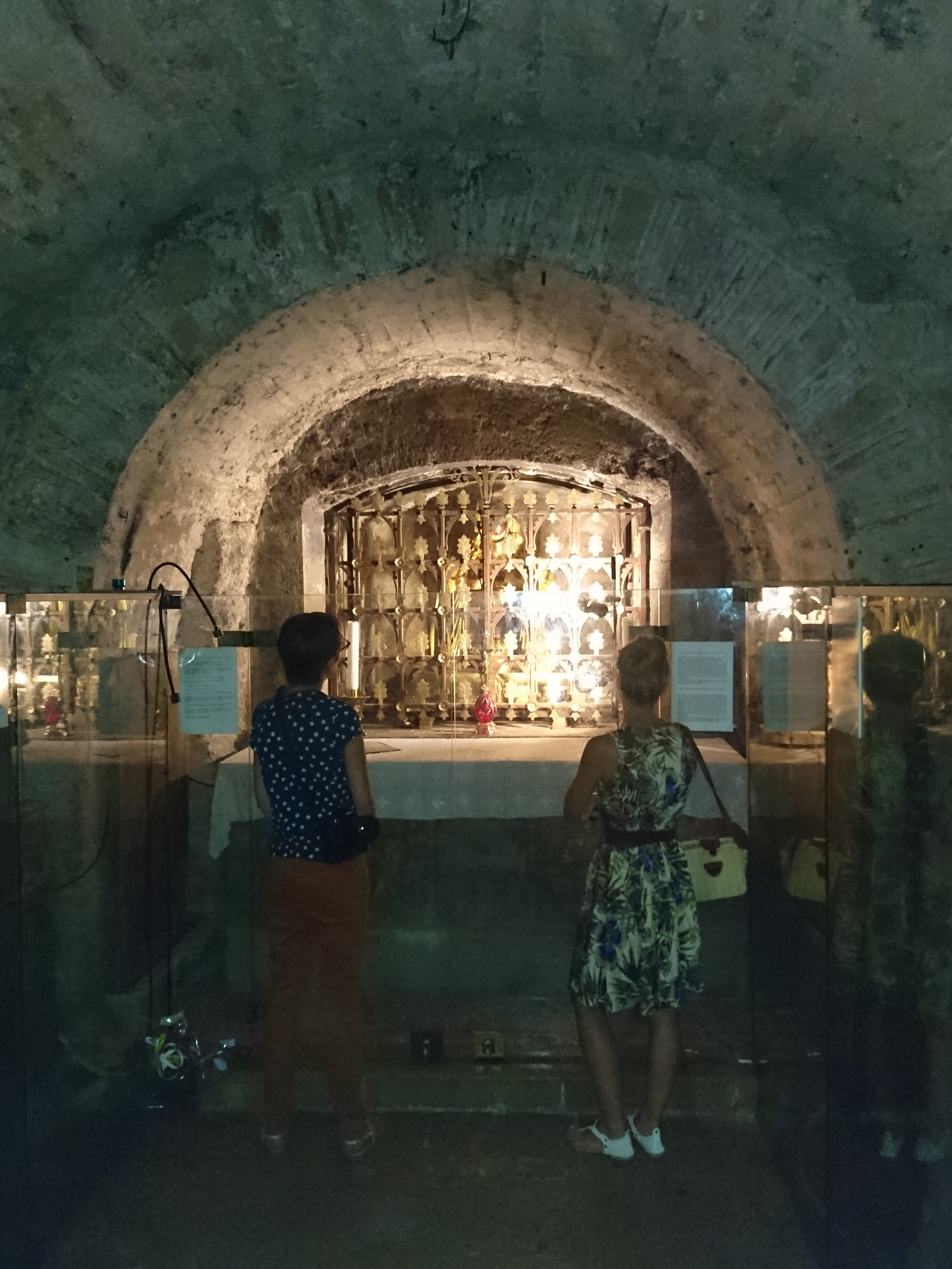 L'escalier qui descend vers la crypte du reliquaire de Sainte Marie-Madeleine est dans la pénombre. Il convient de s'assurer de l'avoir complétement descendu avant de regarder le reliquaire !