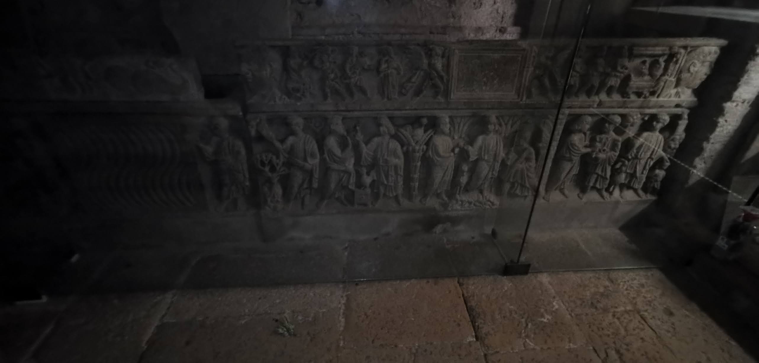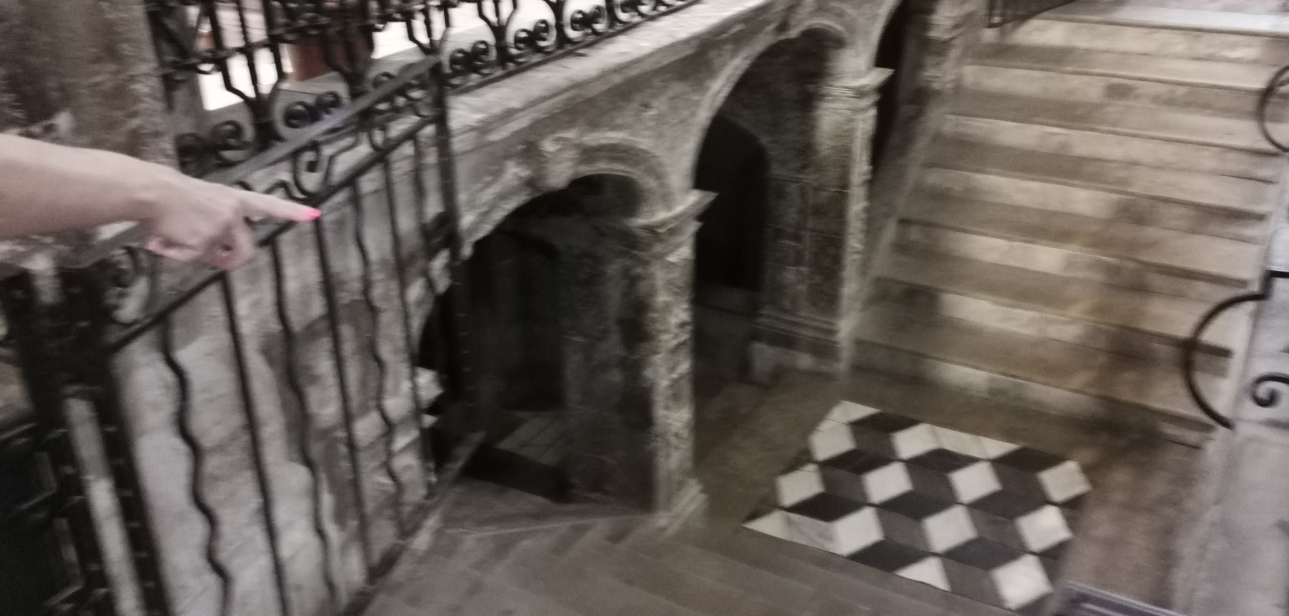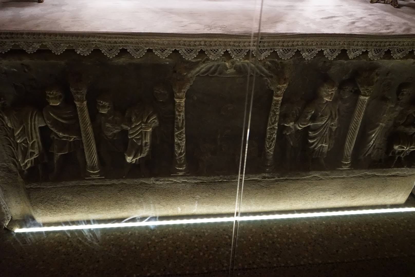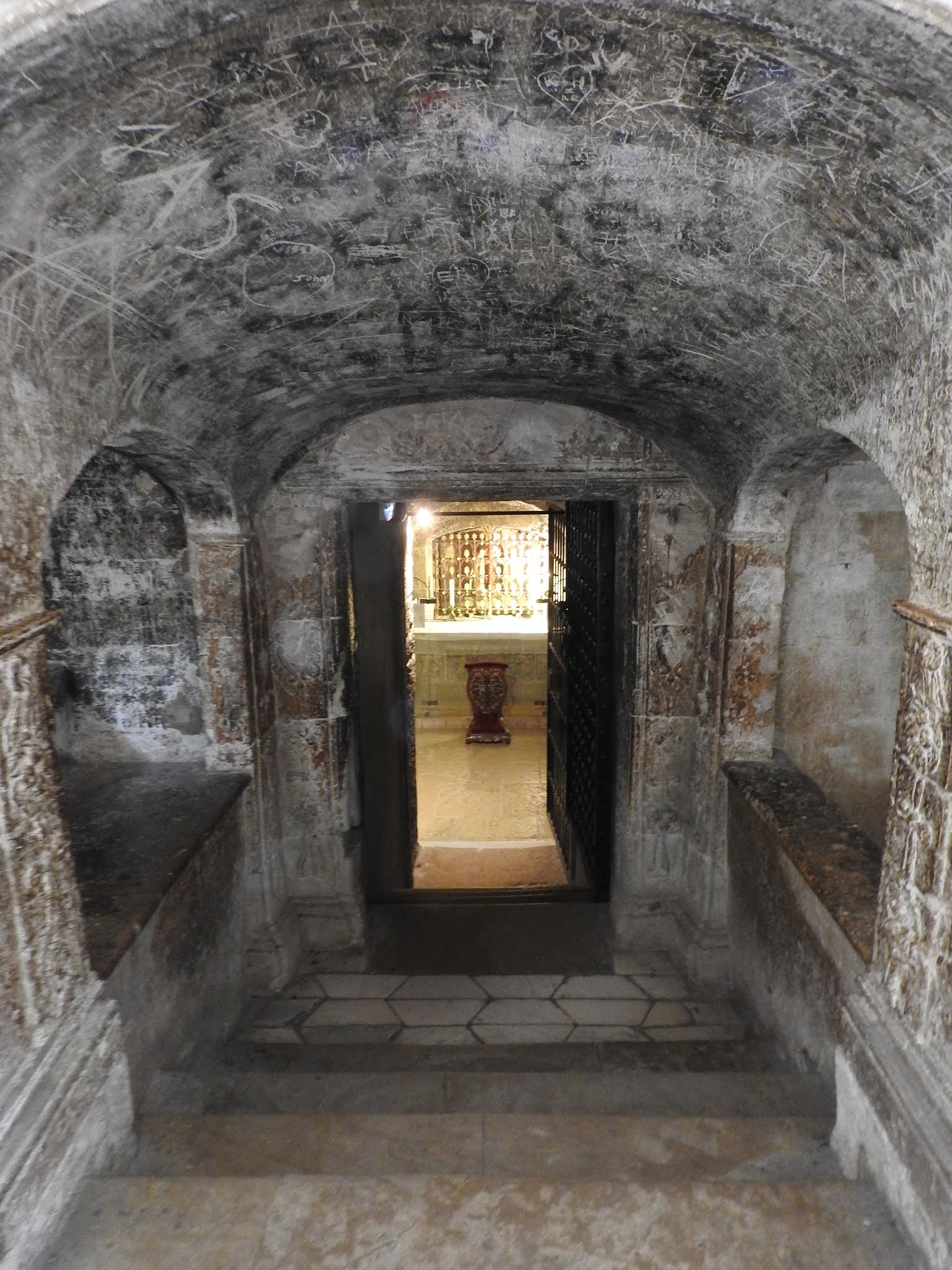 L'escalier qui descend vers la crypte du reliquaire de Sainte Marie-Madeleine est dans la pénombre. Il convient de s'assurer de l'avoir complétement descendu avant de regarder le reliquaire !