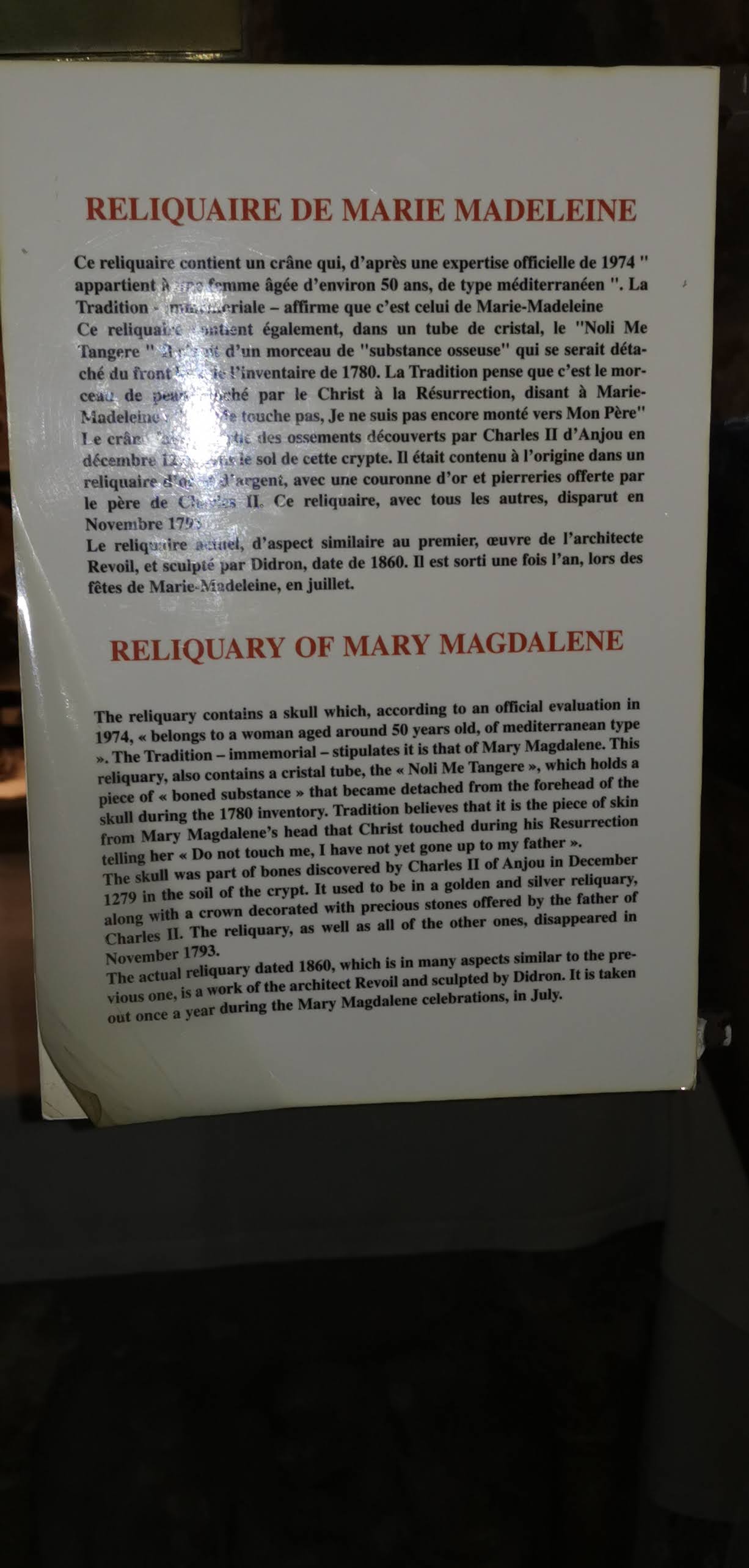 Impressionnant de se retrouver face aux reliques de Sainte Marie-Madeleine ! Reste à urgemment remettre en état cette édifice, qui le mérite tout autant que Notre-Dame de Paris !