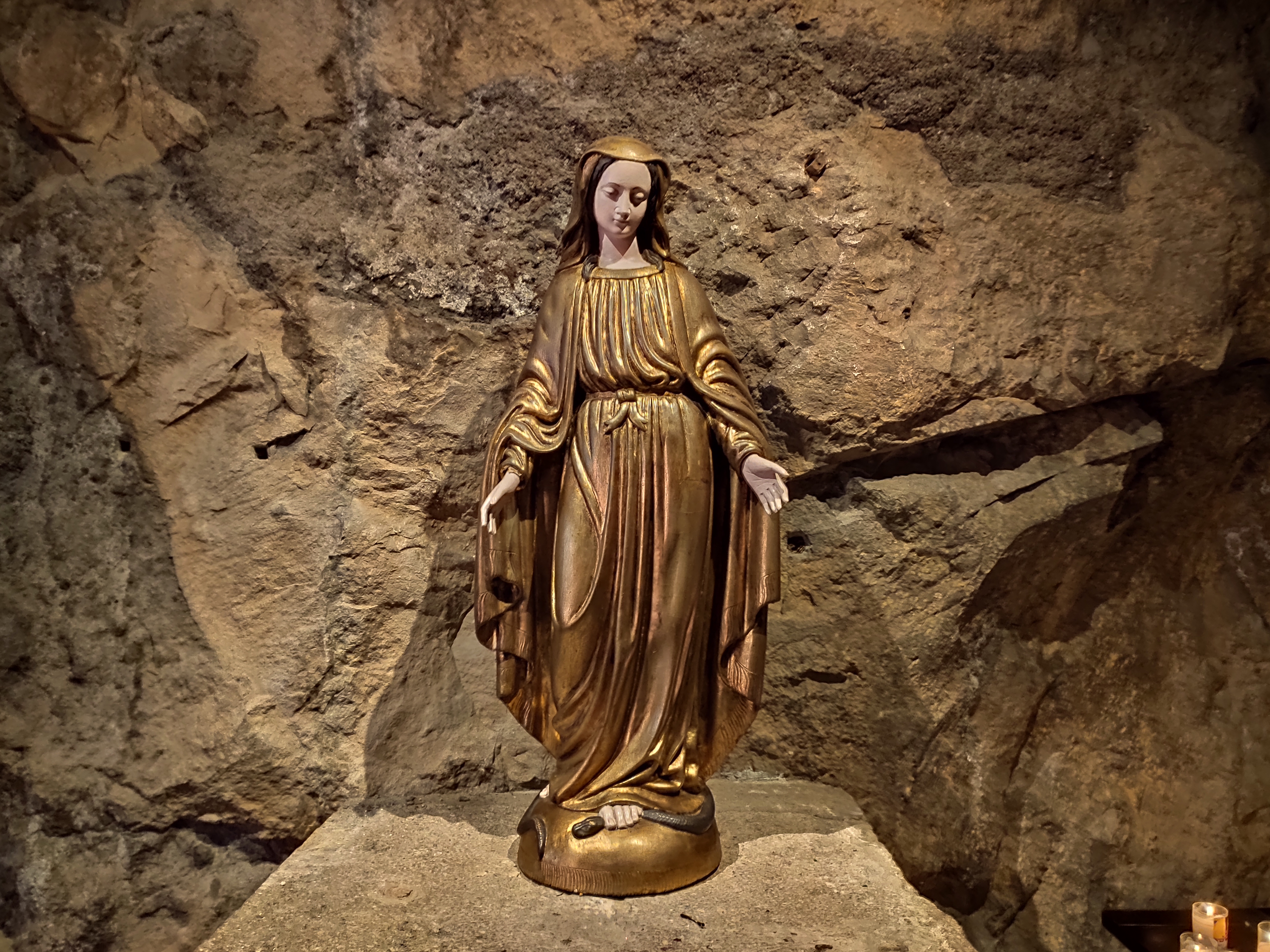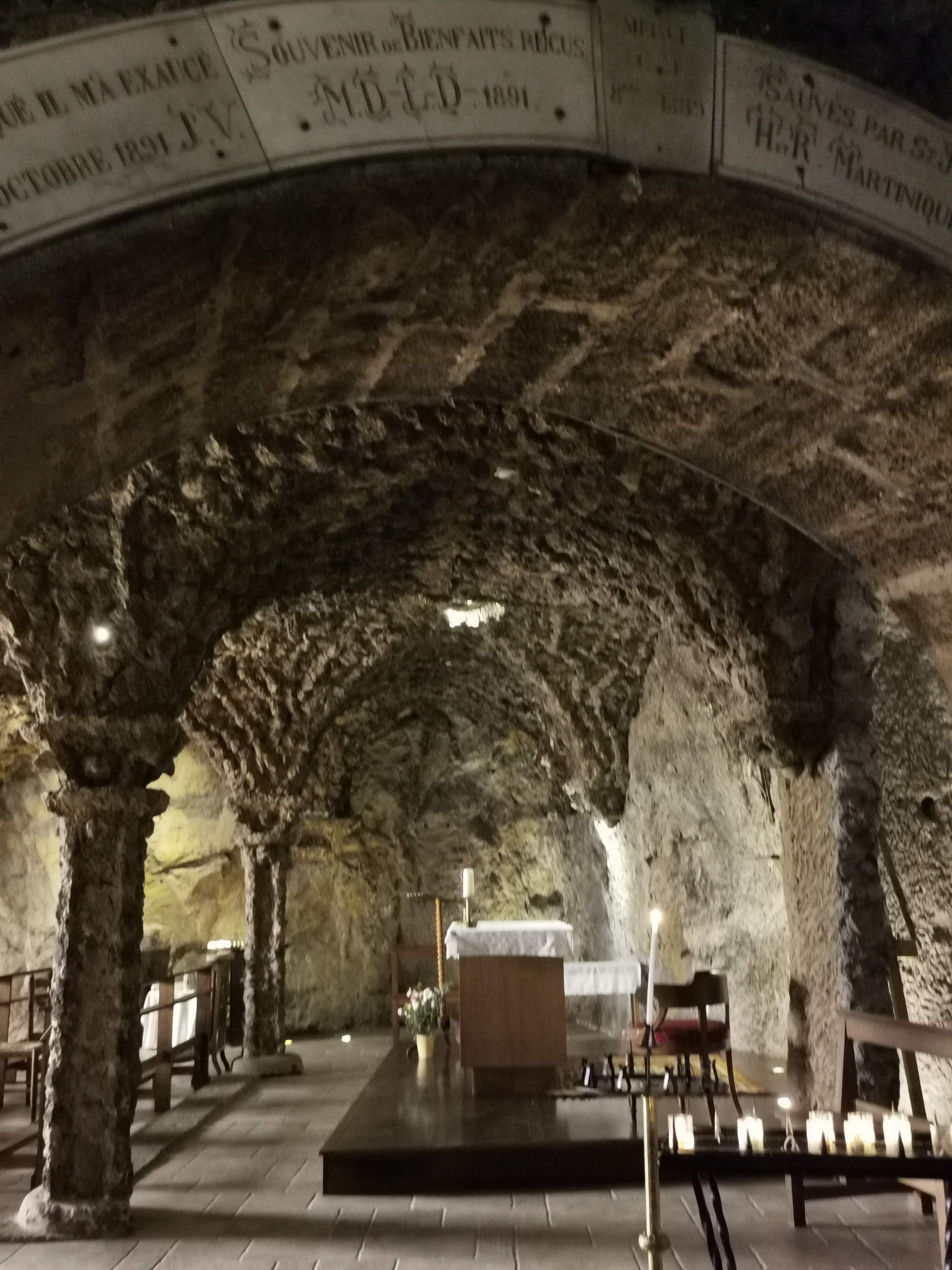 La grotte est tout simplement un moment de silence, nos oreilles ne sont plus habituées à ce silence, un lieu où se sent bien. La vue sur le Rocher, la Statue notre Dame, et sur la cathédrale, les 3 monuments alignés.. vue magnifique..